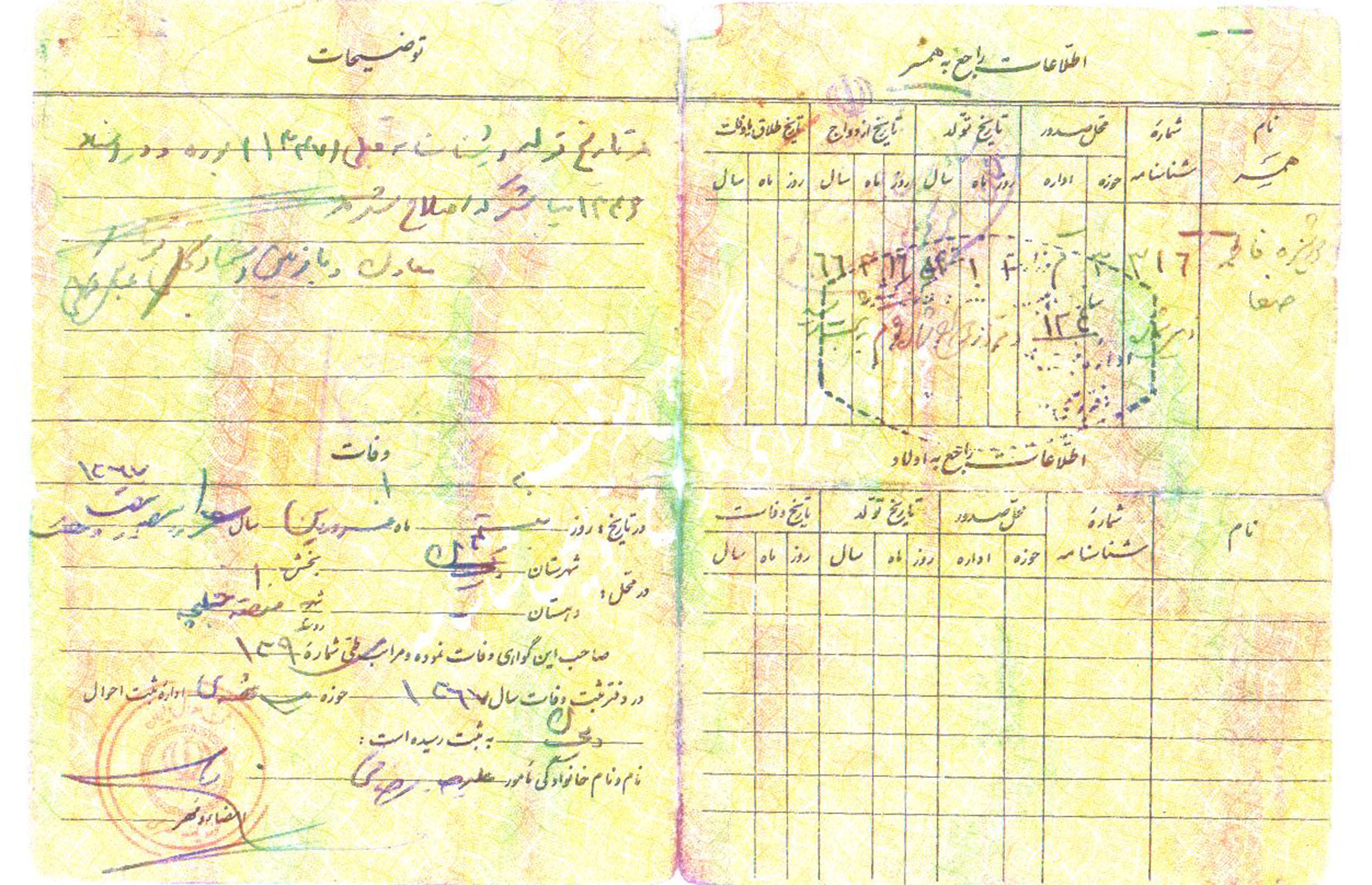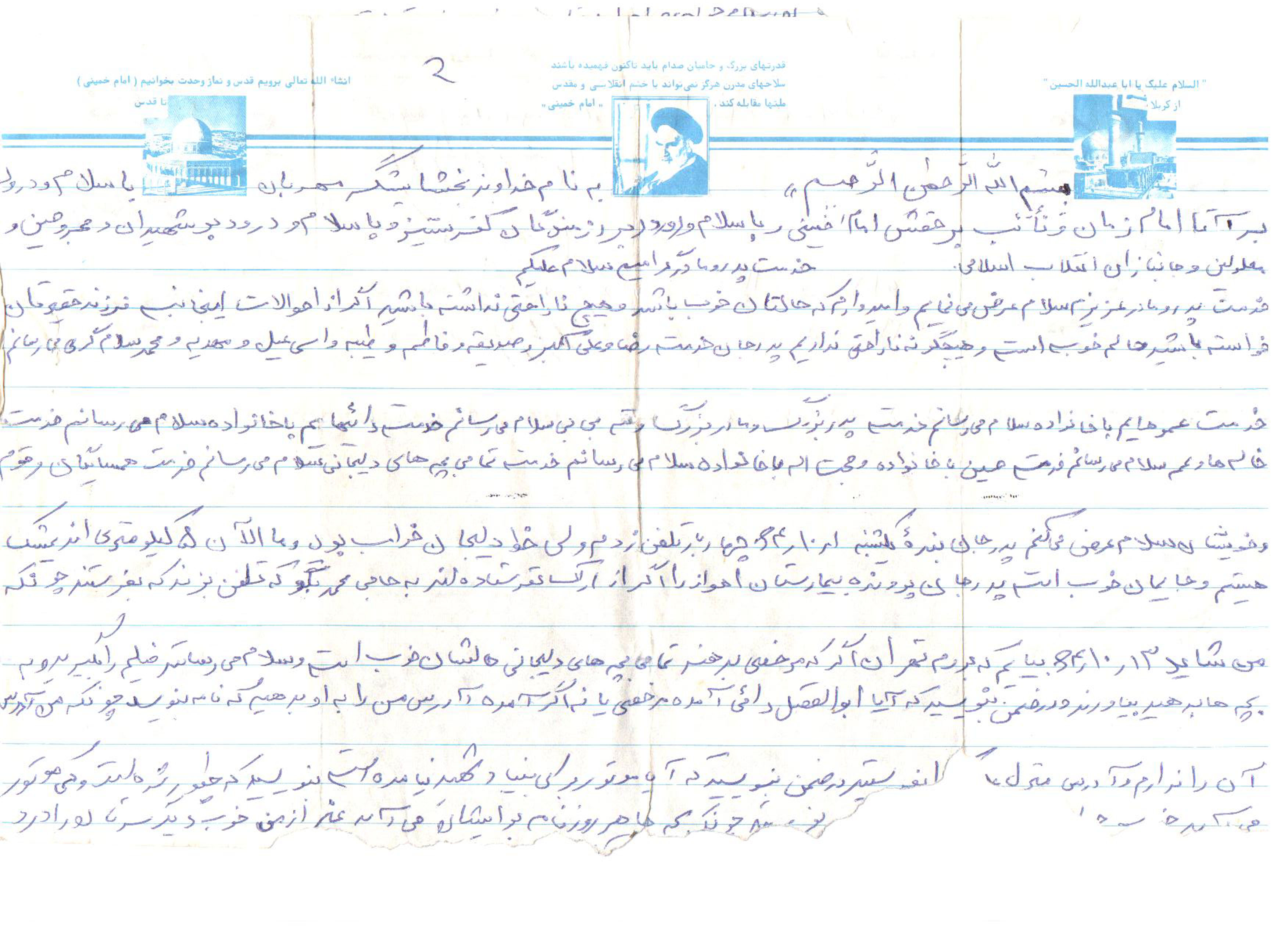 خدمت پدر و مادر عزیزم سلام عرض می نمایم و امیدوارم که حالتان خوب باشد و هیچ ناراحتی نداشته باشید اگر از احوالات اینجانب فرزند حقیرتان خواسته باشید حالم خوب است و هیچ گونه ناراحتی نداریم پدر جان خدمت رضا و علی اکبرو صدیقه و فاطمه و طیبه و اسماعیل و مهدیه و محمد سلام گرمی می رسانم خدمت عموهایم با خانواده سلام می رسانم خدمت پدربزرگ و مادر بزرگ و ننه بی بی سلام می رسانم خدمت دایی هایم با خانواده سلام می رسانم خدمت خاله ها و عمه ها سلام می رسانم خدمت حسین با خانواده و حجت االله با خانواده سلام می رسانم خدمت تمامی بچه های دلیجانی سلام می رسانم خدمت همسایگان و قوم و خویشان سلام عرض می کنم پدر جان بنده یکشنبه 64/10/1 چهار بار تلفن زدم ولی خط دلیجان خراب بود و ما الآن 5 کیلومتری اندیمشک هستیم و جایمان خوب است پدر جان پرونده بیمارستان اهواز را اگر از اراک نفرستانده اند به حاجی محمد بگو که تلفن بزند که بفرستد چونکه من شاید 64/10/13 بیایم که بروم تهران اگر که مرخصی بدهند تمامی بچه های دلیجانی حالشان خوب است و سلام می رسانند فیلم را بگیرید و به بچه ها بدهید بیاورند و در ضمن بنویسید که آیا ابوالفضل دایی آمده مرخصی یا نه اگر آمده آدرس من را به او بدهید که نامه بنویسد چونکه من آدرس آن را ندارم و آدرس منزل ؟؟؟ را بفرستید در ضمن بنویسید که آیا موتور برای بنیاد شهید نیامده است بنویسید که چه طور شده است و کی موتور می آید خوب ؟؟؟؟؟ بفرستید چونکه بچه ها هر روز نامه برایشان می آمد غیر از من خوب دیگر سرتان را درد نمی آورم