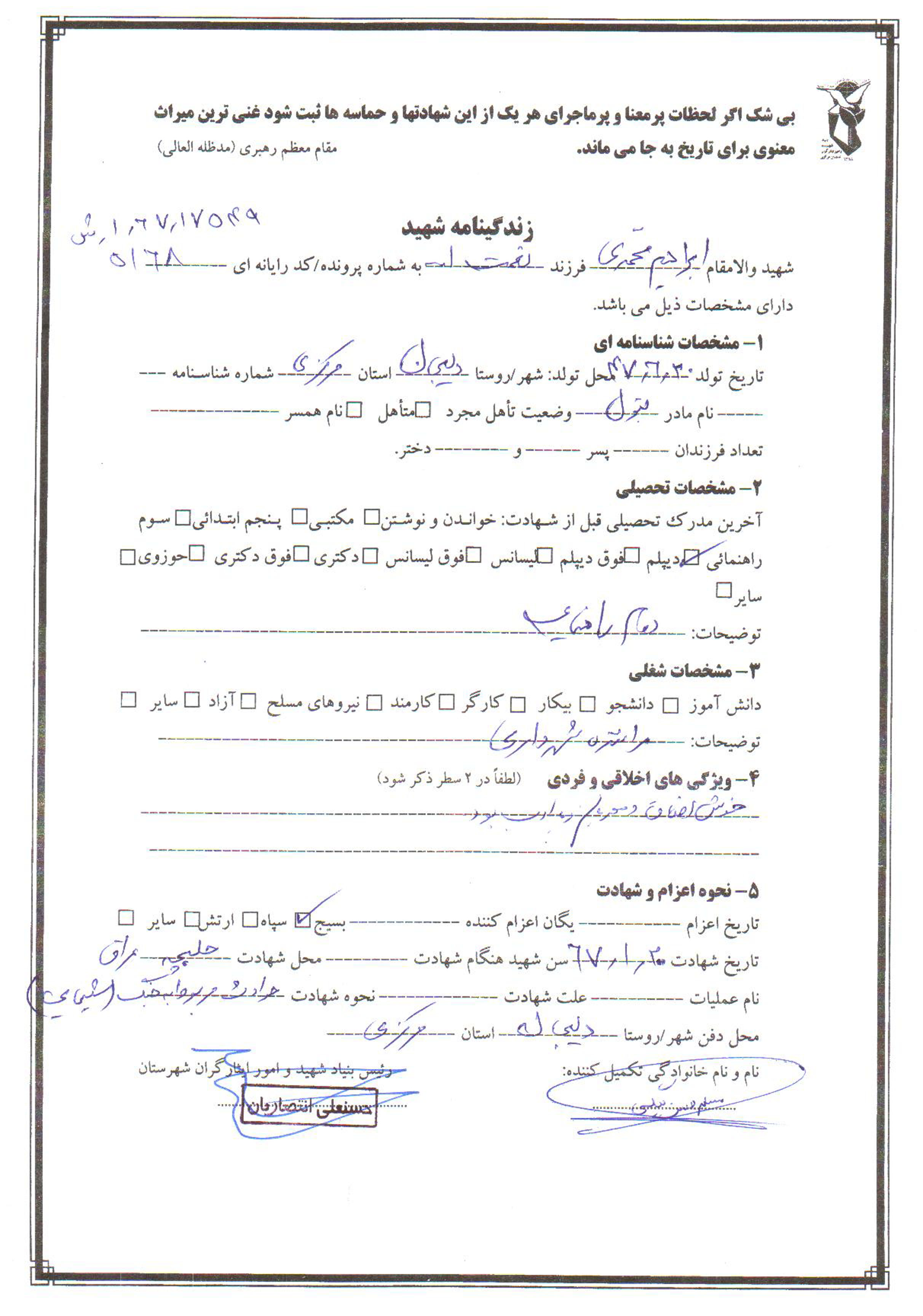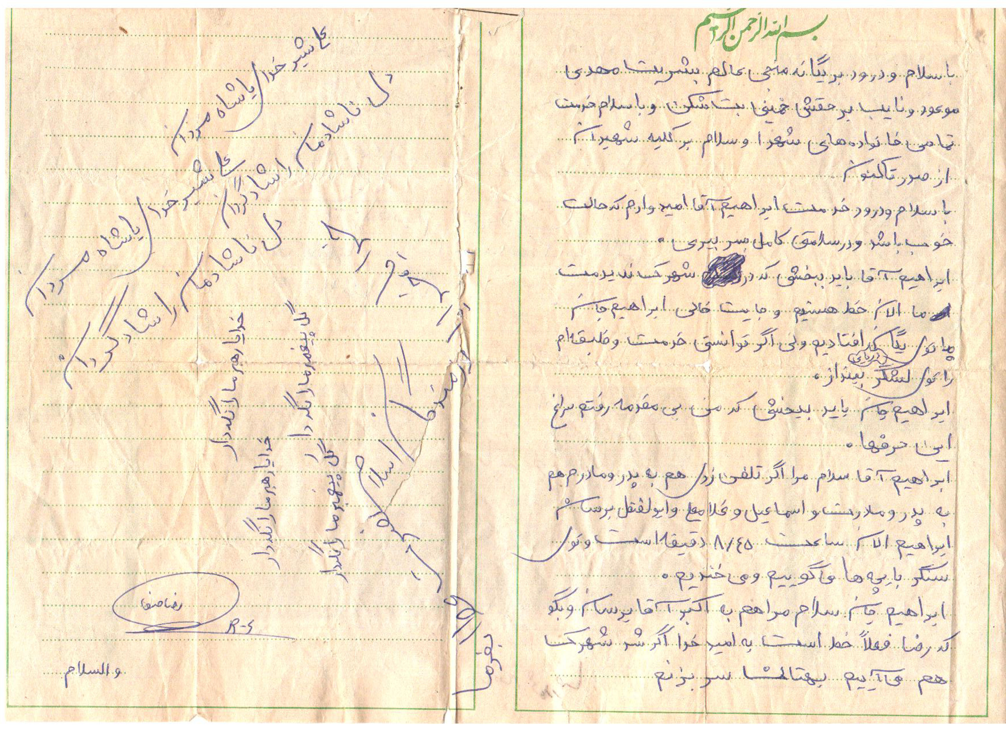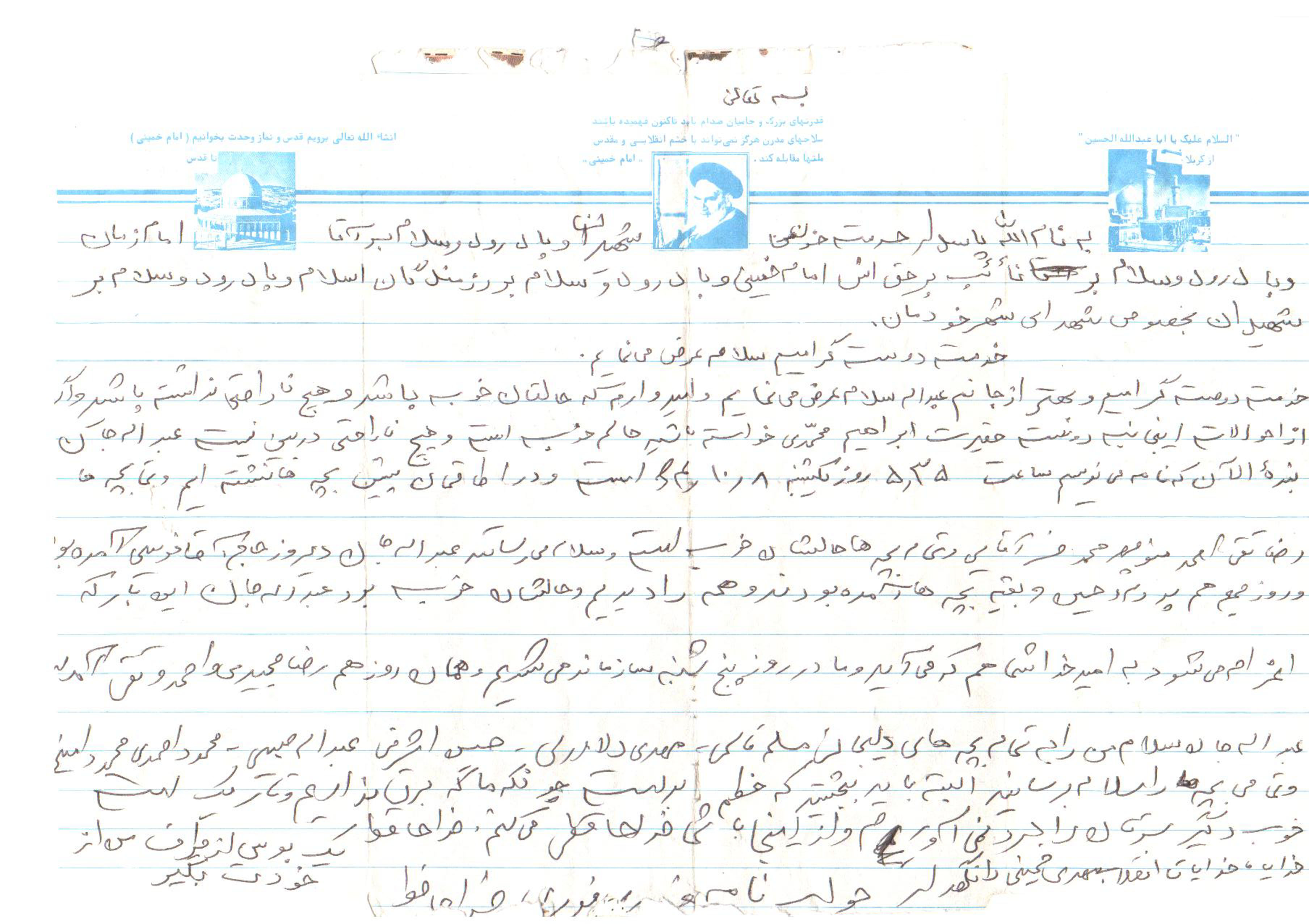 حضور پدر و مادر گرامیم سلام علیکم پس از عرض سلام و سلامتی شما را از درگاه خداوند تعالی خواهان و خواستارم و امیدوارم که حالتان خوب باشد. اگر از احوالات این جانب فرزند حقیرتان خواسته باشید سلامتی برقرار می باشد و به دعا گوئی شما مشغول می باشم پدر جان نامه عمو قربان علی دیروز به دستم رسید روز سه شنبه 66/10/15 بدستم رسید پدر جان الان که نامه می نویسم ساعت3/45 دقیقه روز چهار شنبه 66/10/16 می باشد. پدر جان از قول من به مادر و اسماعیل و طیبه و ننه آقا و صدیقه و مهدیه و محمد و عمو قربان علی با خانواده و دائی ها و خاله و عموها سلام برسانید وعمه و ننه بی بی و کلیه دوستان و آشنایان سلام برسانید. و از قول من از آنها حلالیت بطلبید . خوب پدر جان علی اکبر هم سلام می رساند و حالش خوب می باشد . دیروز فرماندار آمده بود پیش ما و یک شب پیش ما بود و رفت خوب دیگر مزاحم وقت گرامیتان را نمی شوم و با شما خدا حافظی می کنم . به امید پیروزی رزمندگان کفر ستیز در تمامی جبهه.