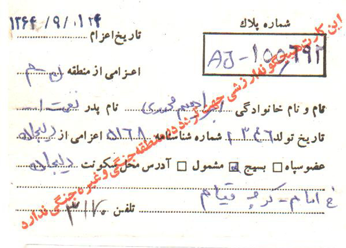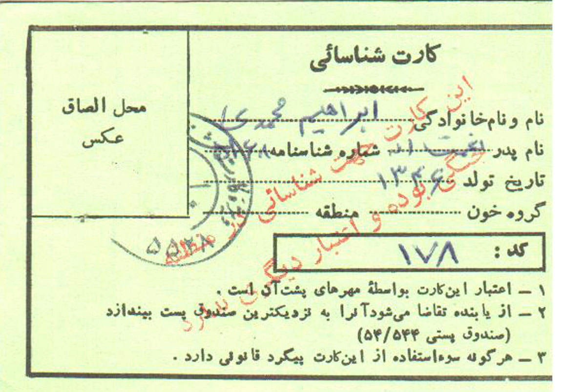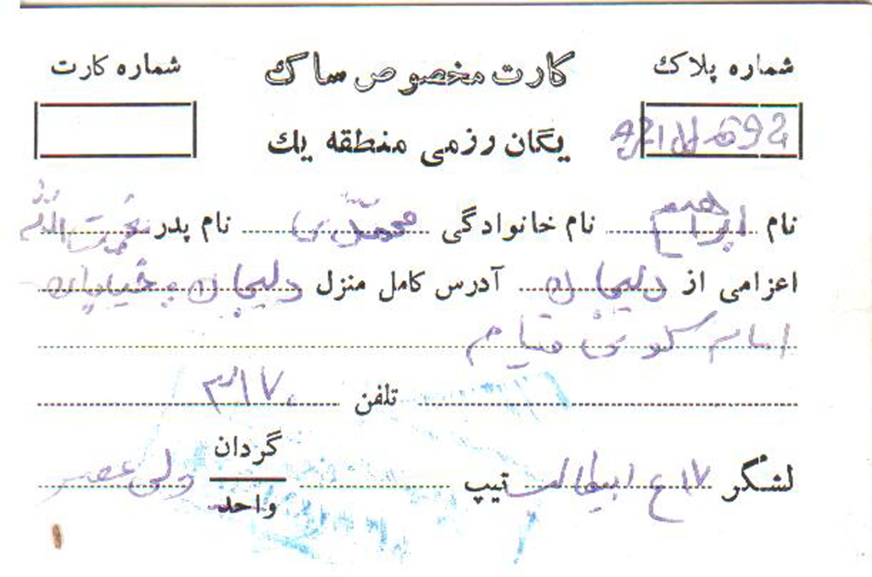 آدرس فرستنده: منطقه جنگی 1 کد پستی 1154- 61335 کد فرعی 99 برسد به دست ابراهیم محمدی