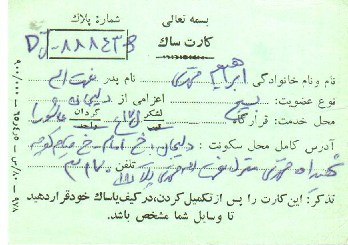 حضور پدر و مادر گرامیم سلام علیکم پس از عرض سلام و سلامتی شما را از درگاه خداوند تعالی خواهان و خواستارم و امیدوارم که حالتان خوب باشد. اگر از احوالات این جانب فرزند حقیرتان خواسته باشید سلامتی برقرار می باشد و به دعا گوئی شما مشغول می باشم پدر جان الان که این نامه را می نویسم ساعت8/10دقیقه می باشد روز چهار شنبه 66/10/30 می باشد. شب پنج شنبه . خوب پدر جان فردا محمد دلاوری به دلیجان می آید و آمد گفت هر کس نامه می خواهد بنویسد و ما هم این نامه را نوشتیم . پدر جان من در روز یک شنبه به پیش بچه ها آمدم . همگی حالشان خوب می باشد و سلام می رسانند . پدر جان از قول من به مادر عزیز و مهربان و دلسوزم سلام گرمی برسانید . خدمت صدیقه و اسماعیل و طیبه و مهدیه و محمد سلام گرمی برسانید خدمت عمو و زن عمو و فاطمه سلام گرمی برسانید . خدمت ننه بابا و ننه بی بی و دائیها و خاله ها عموها و عمه با خانواده سلام برسانید . پدر جان علی اکبر هم تا الان که ندیده ام نمی دانم اهواز باشد یا اندیمشک . خوب راستی می خواستم ببینم رفته اید خانه بالا یا خیر اگر نر فته اید بروید و اثاث کشی بکنید . امیدوارم که اینکار را حتماً انجام بدهید . خوب دیگر مزاحم وقت گرامیتان نمی شوم و با شما خداحافظی می نمایم . به امید پیروزی رزمندگان اسلام . از قول من اسفندیار ، عباس قاسمی ، رضا پاسدار ، ابوالفضل دائی، غلامعلی خاله ، حاج میرزا علی سید علی، ابوالفضل آقا کمالی به همگیشان سلام برسانید. دگیر عرضی ندارم جز دوری شما . به امید دیدار.