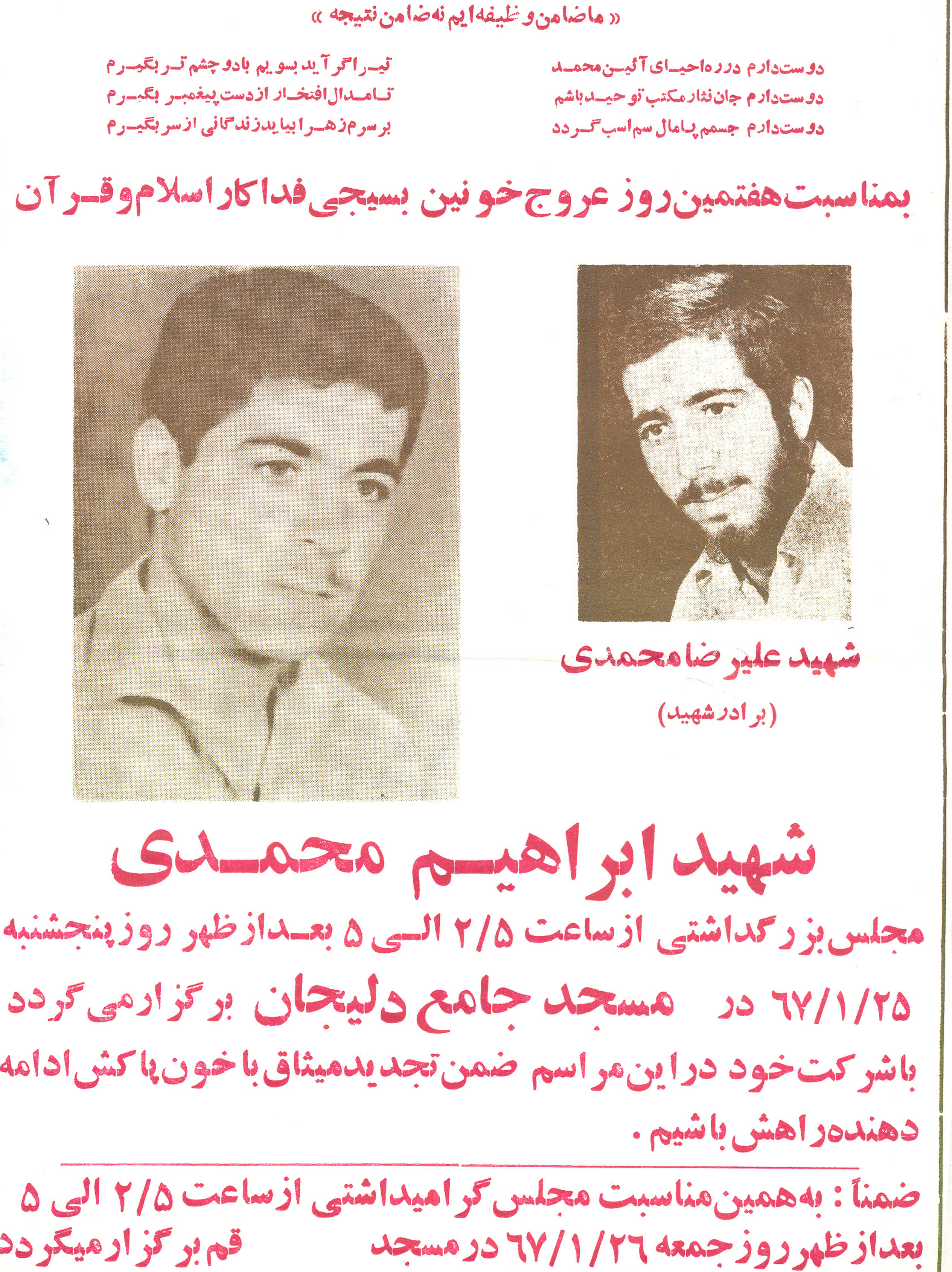 خدایا خدایا تا انقلاب مهدی خمینی را نگه دار . رزمندگان را دعا کنید . وسلام ابراهیم محمدی 66/10/30