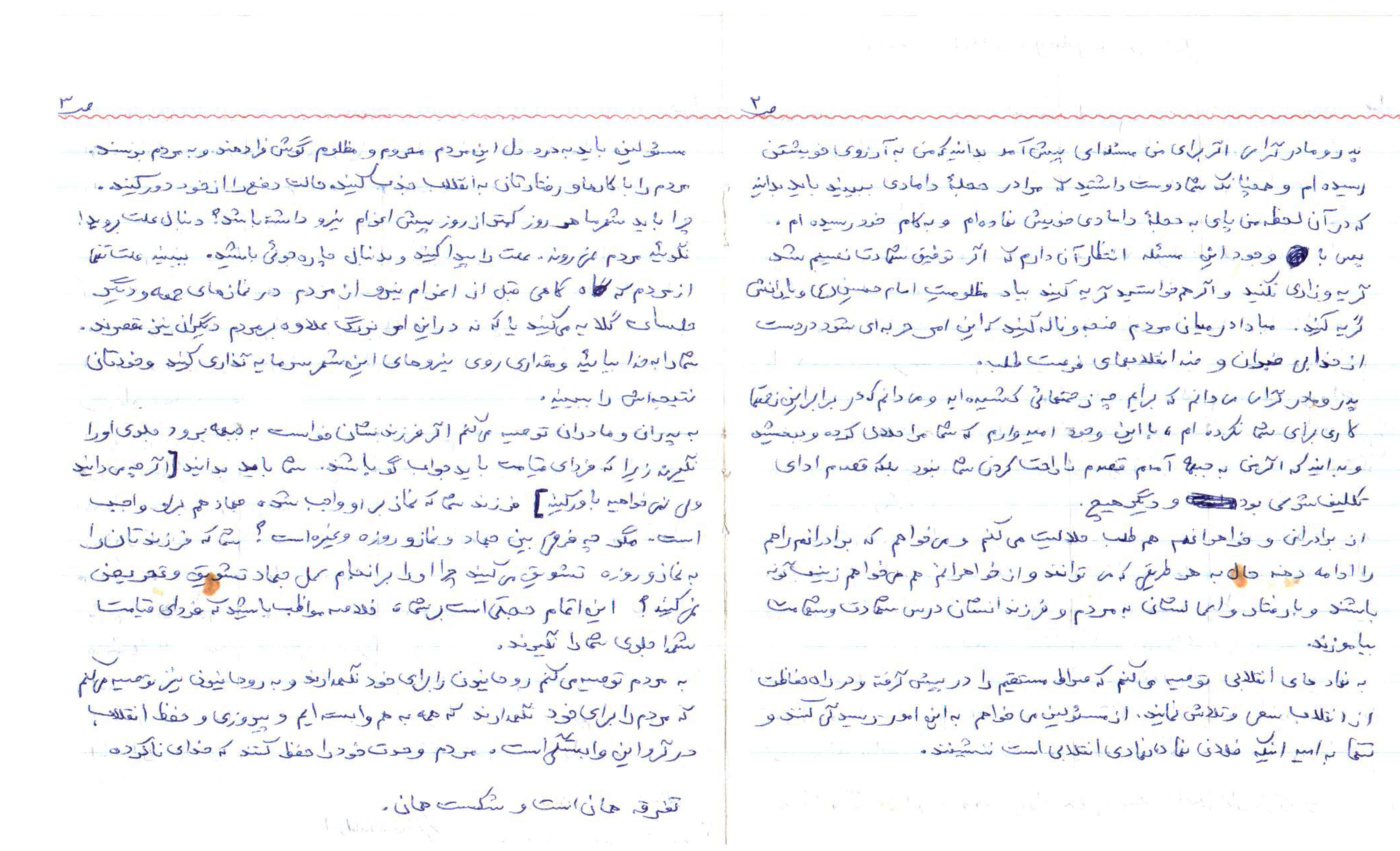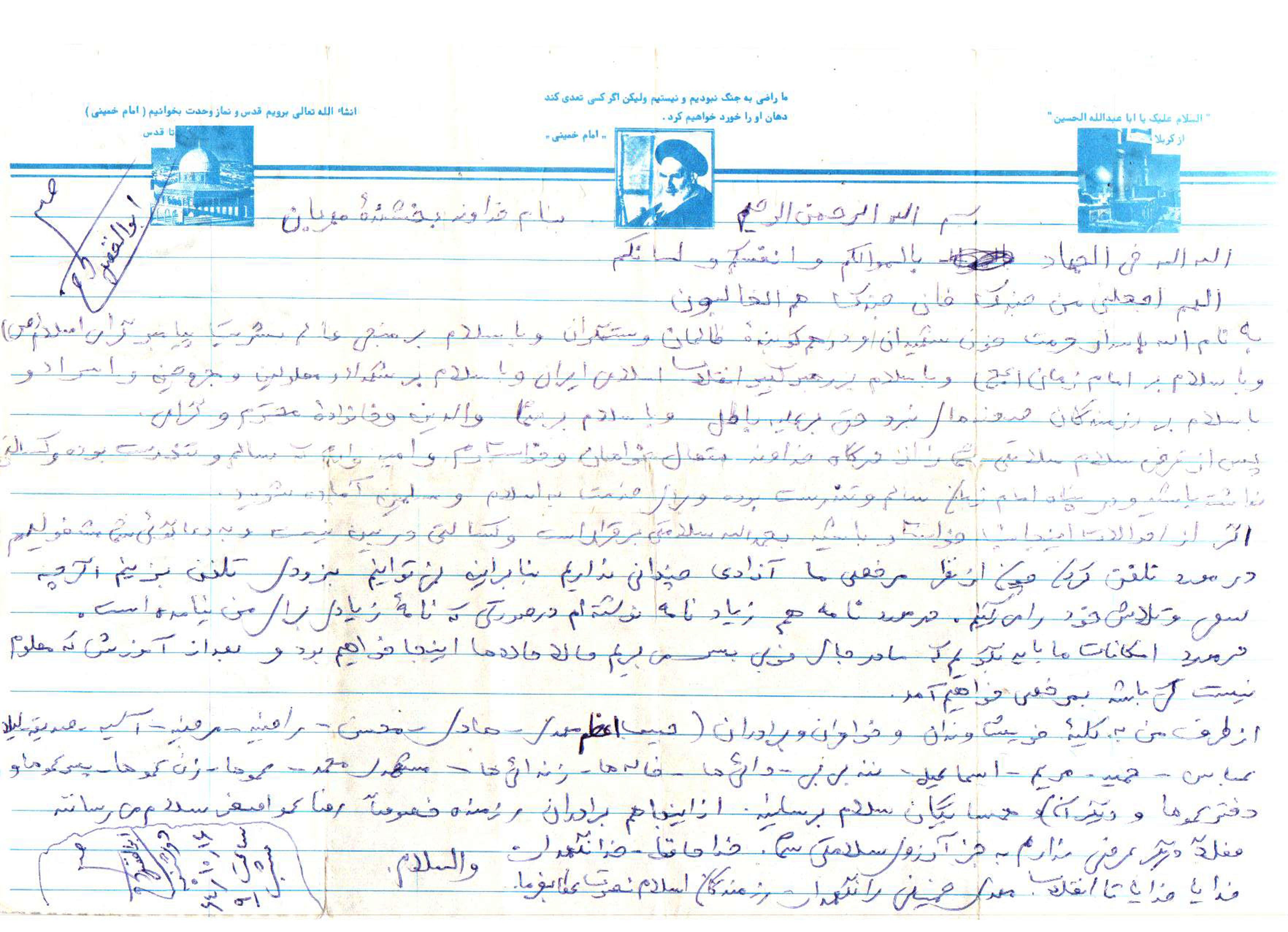از طرف من به کلیه خویشاوندان و خواهران و برادران (حبیب واعظم مهدی هادی محسن راضیه مرضیه اسیه صدیقه لیلا عباس حمید مریم اسماعیل ننه بی بی دایی ها خاله ها زندایی ها مشهدی محمدعموها زن عموها پسرعموهای ودخترعموها ودیگران)و همسایگان سلام برسانید از اینجا هم برادران رزمنده خصوصاً رضا عمو اصغر سلام می رسانند فعلاً دیگر عرضی ندارم بجز ارزوی سلامتی شما خداحافظ خدانگهدار