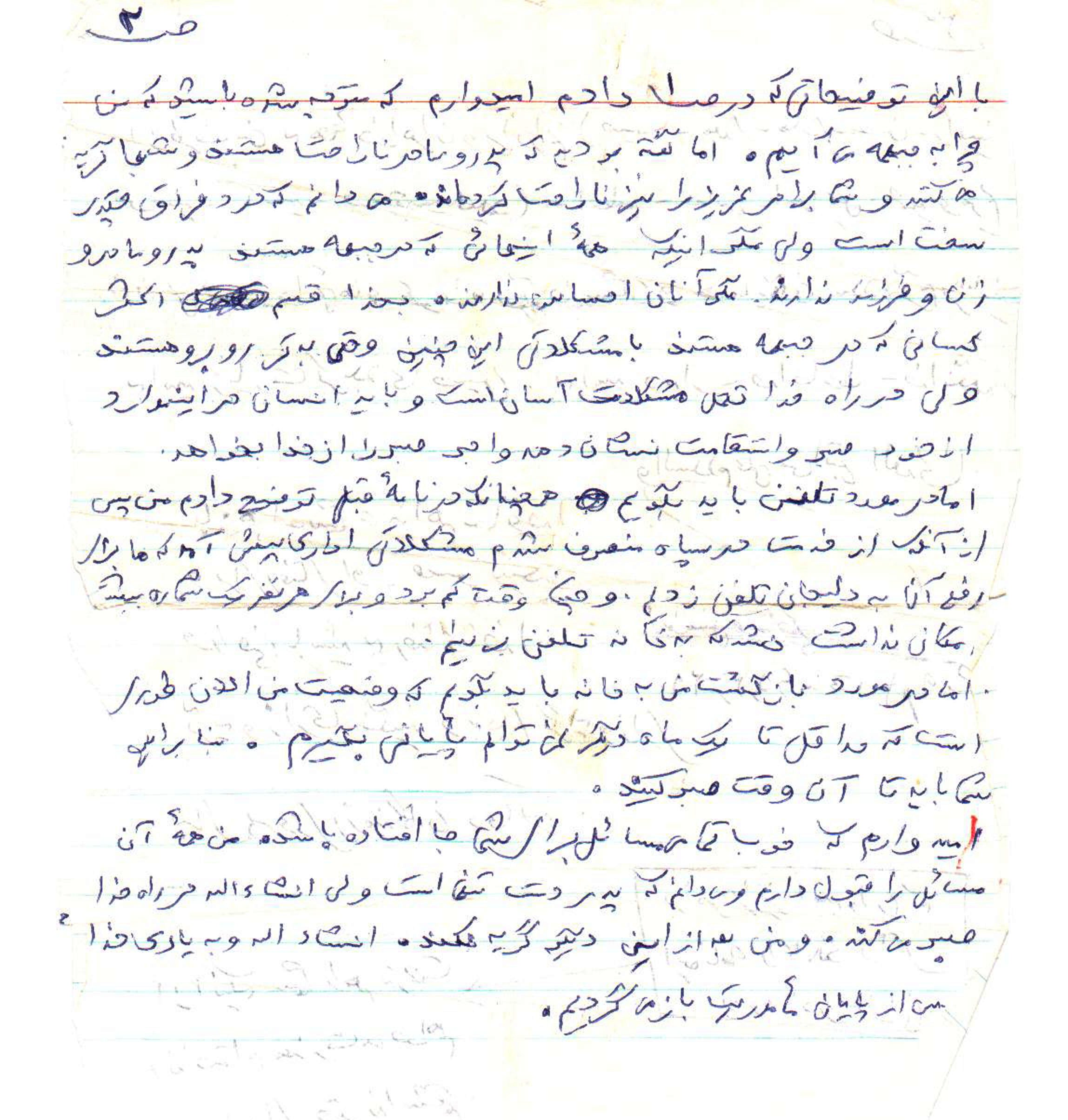 با این توضیحاتی که در صفحه یک دادم امیدوارم که متوجه شده باشید که من چرا به جبهه می ایم امام گفته بودید که پدر ومادر ناراحت هستید و شبها گریه می کنند وشما برادر عزیز را نیز ناراحت کرده اند می دانم که درد فراق چقدر سخت است ولی مگر اینکه همه اینهایی که در جبهه هستد پدرو مادر و زن و فرزند ندارند مگر انان احساس ندارند بخدا قسم اکثر کسانی که در جبهه هستند با مشکلاتی این چنین و حتی بدتر روبرو هستند ولی در راه خدا تحمل مشکلات اسان است و باید انسان ؟؟؟؟ازخود صبر واستقامت نشان دهد واجر صبر را از خدا بخواهد