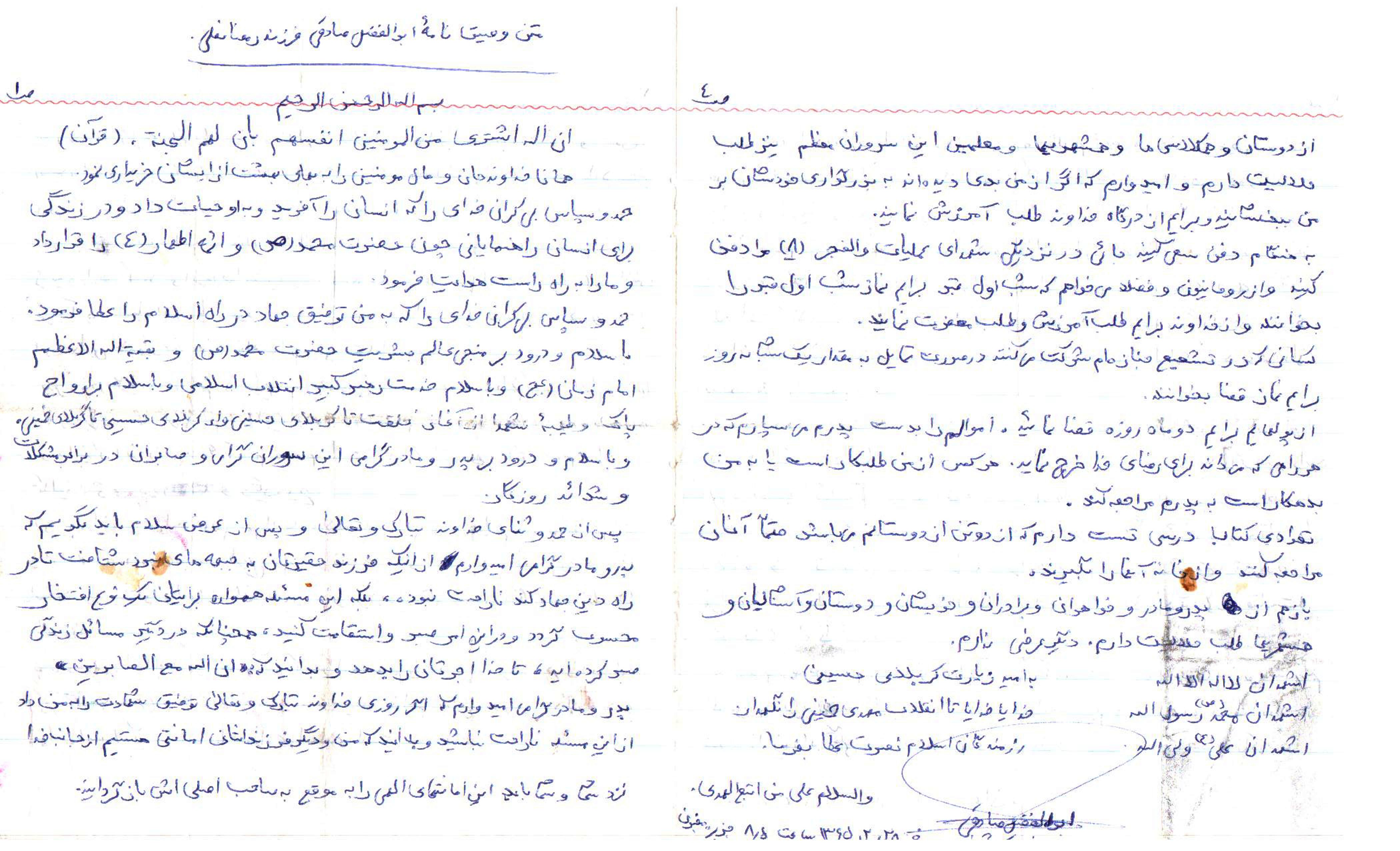 پدر ومادر گرامی میدانم که برایم چه زحمتهایی کشیده اید و می دانم که در برابر این زحمتها کاری برای شما نکرده ام با این وجود امیدوارم که شما مرا حلال کرده و ببخشید و بدانید که اگر من به جبهه امدم قصدم ناراحت کردن شما نبود بلکه قصدم ادای تکلیف شرعی بود و دیگر هیچ