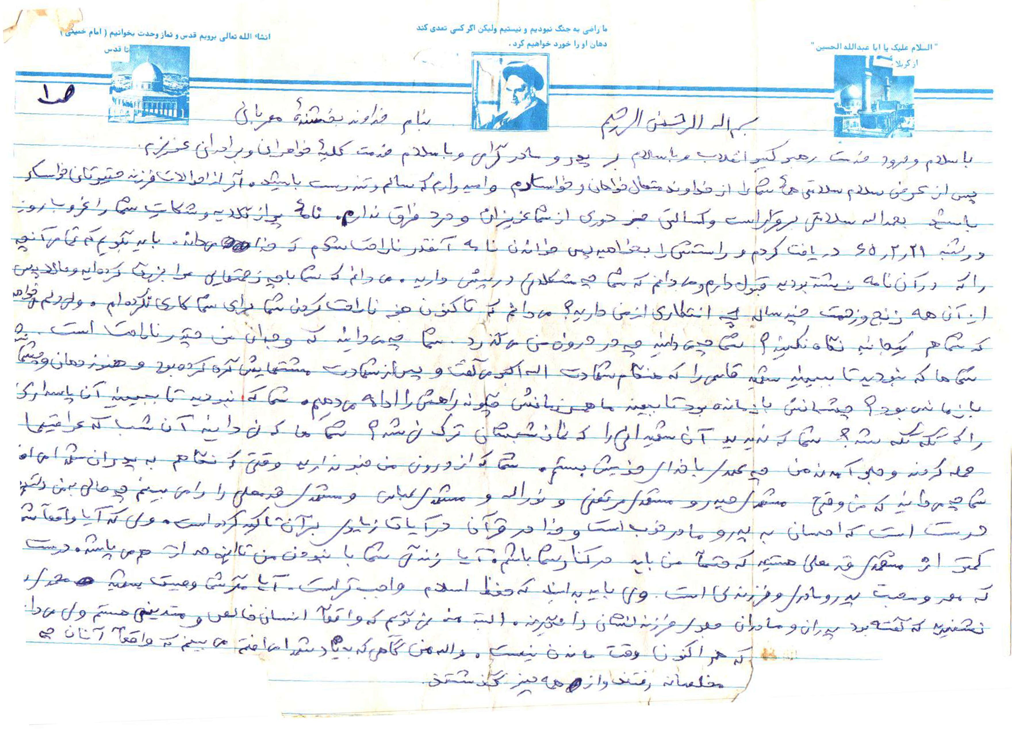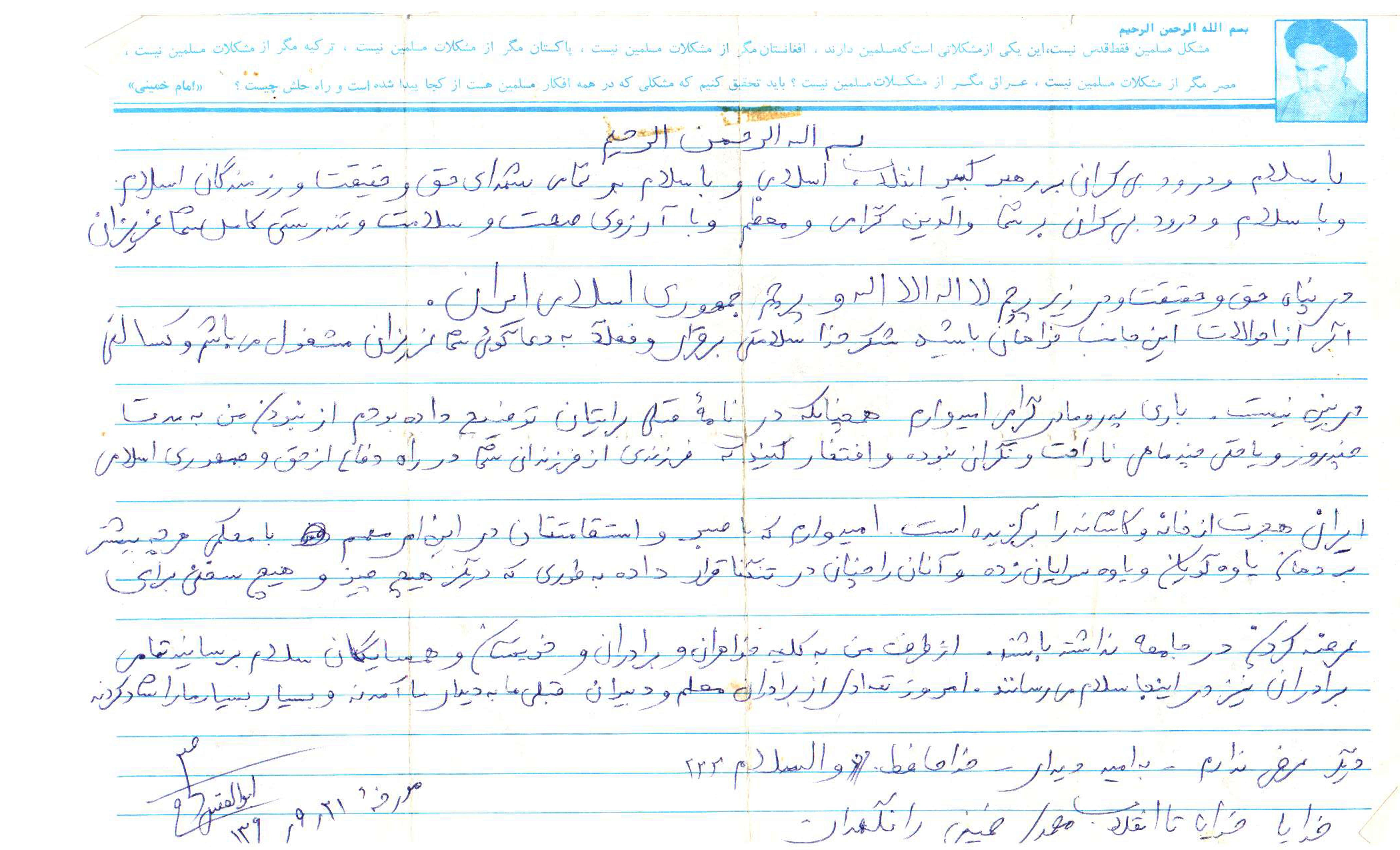 اگر از احوالات این جانب خواهان باشید شکر خدا سلامتی برقرار و فعلاً به دعاگویی شما عزیزان مشغول می باشم و کسالتی در بین نیست باری پدر ومادر گرامی امیدوارم همچنانکه در نامه قبلی برایتان توضیح داده بودم از نبودن من به مدت چند روز و یا حتی چند ماهی ناراحت و نگرانی نبوده و افتخار کنید که فرزندی از فرزندان شما در راه دفاع از حق و جمهوری اسلامی ایران هجرت از خانه و کاشانه را برگزیده است امیدوارم که با صبر و استقامتتان در این امر مهم با محکمی هرچه بیشتر بر دهان یاوه گویان و یاوه سرایان زده و انان را چنان در تنگنا قرار داده به طوری که دیگر هیچ چیز و هیچ سخنی برای عرضه کردن در جامعه نداشته باشند از طرف من به کلیه خواهران و برادران و خویشان وهمسایگان سلام برسانید تمامی برادران نیز در اینجا سلامی می رسانند امروز تعدادی از برادران معلم و دبیران قبلی ما به دیدار ما امدند وبسیار بسیار ما را شاد کردند دیگر عرضی ندارم به امید دیدار خداحافظ والسلام