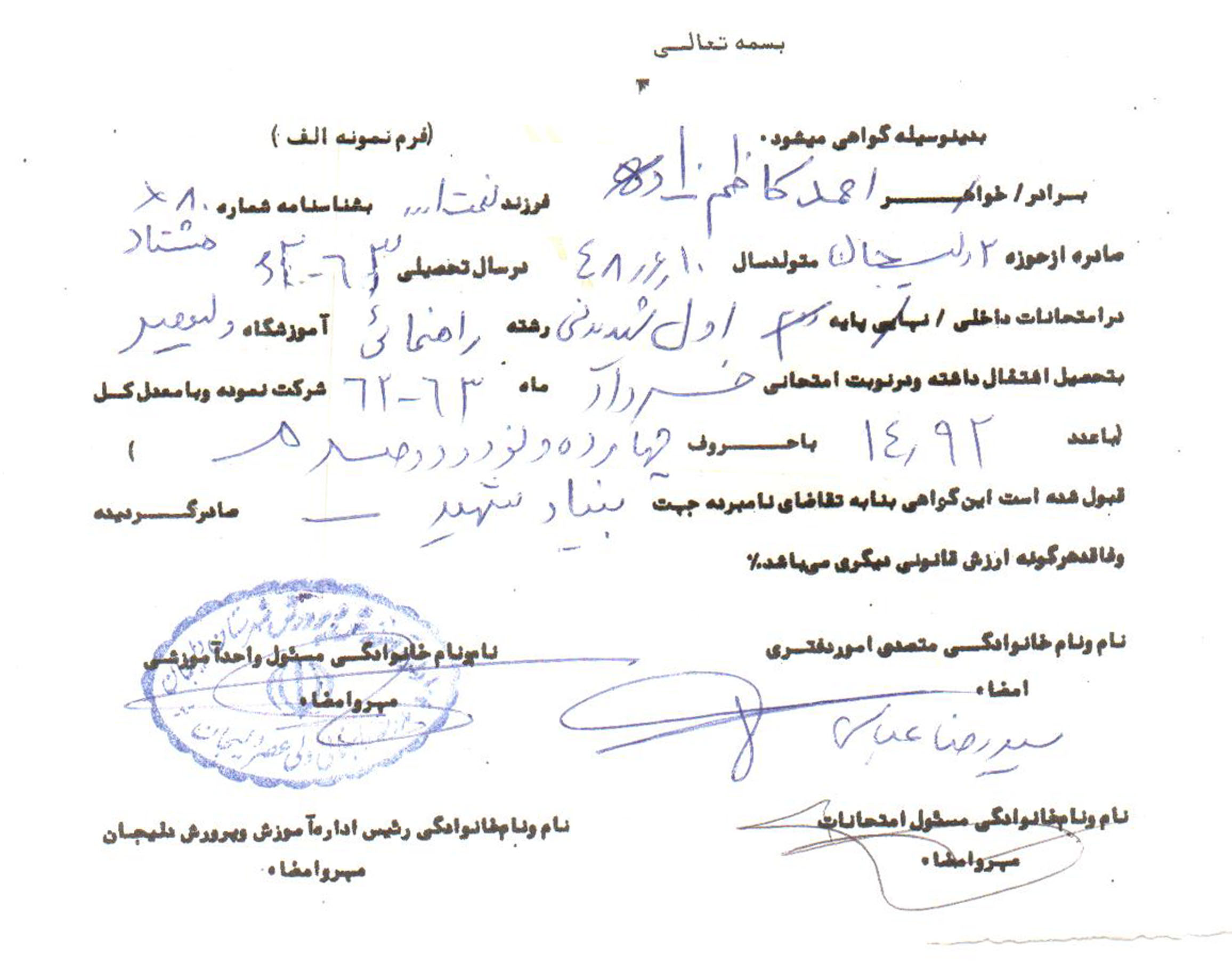 نام خانوادگی: نعمت الله کاظم زاده نسبت با شهید:پدرشهید