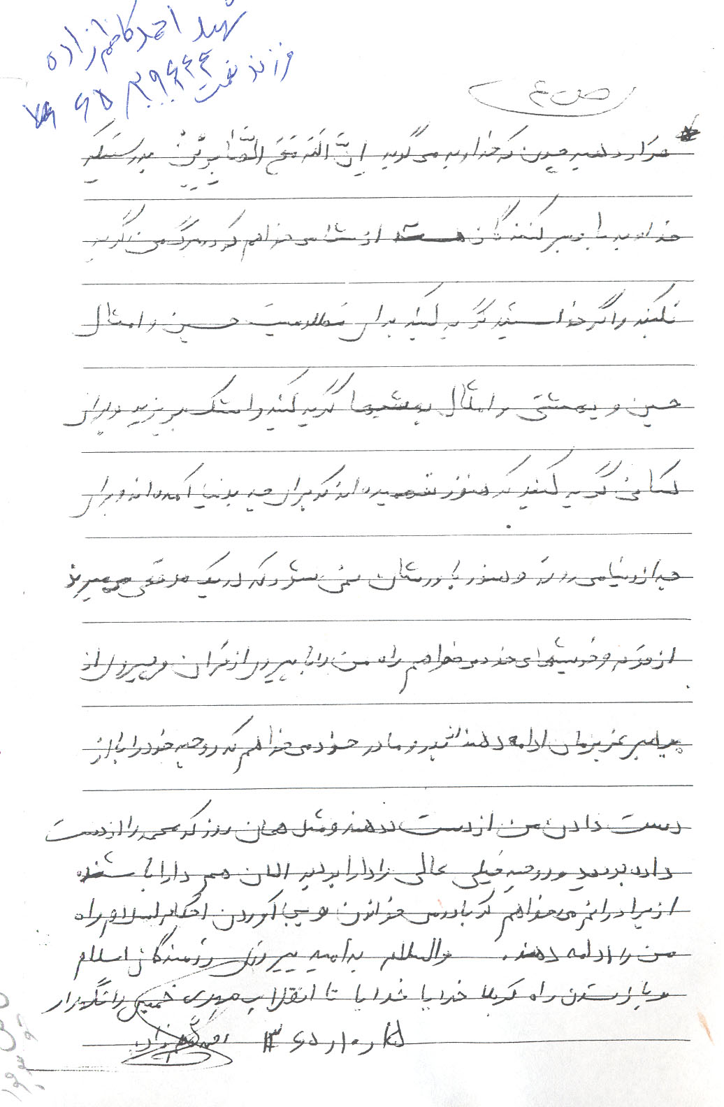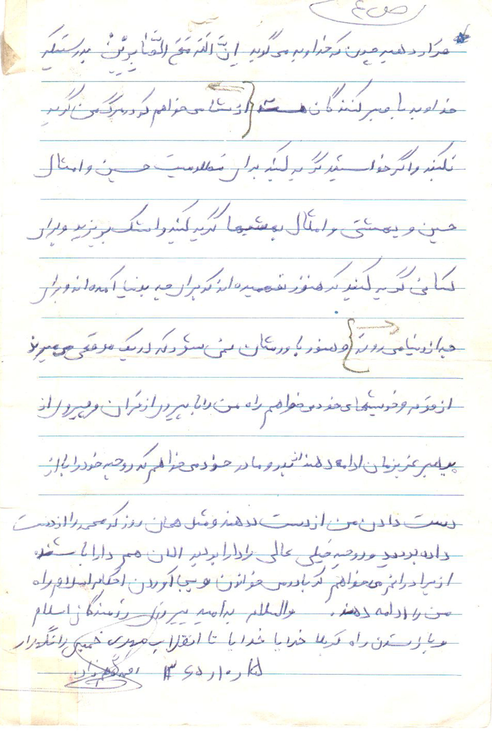 از برادرانم مى خواهم که با درس خواندن و بجا آوردن احکام اسلام راه من را ادامه دهند. والسلام به امید پیروزى رزمندگان اسلام
