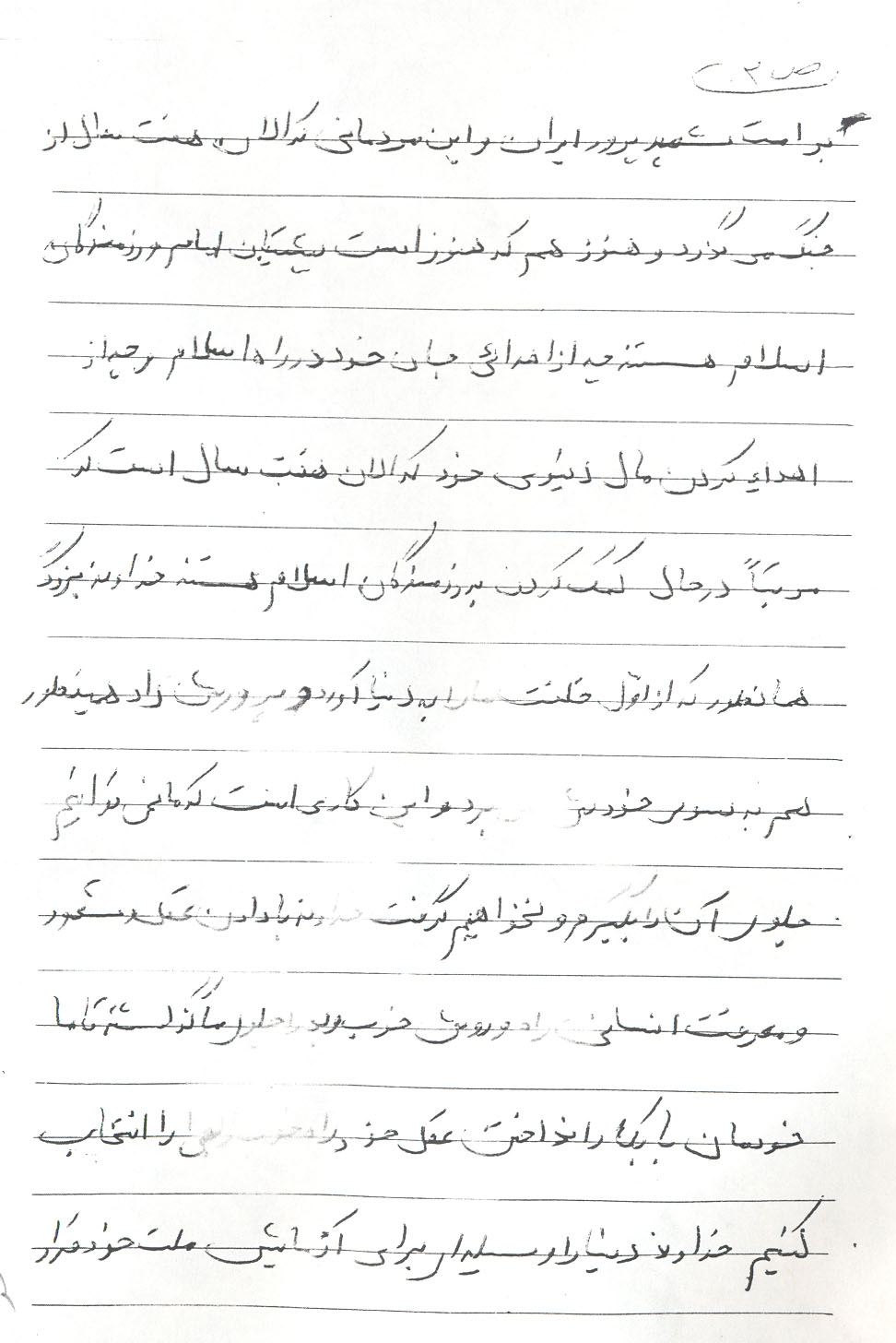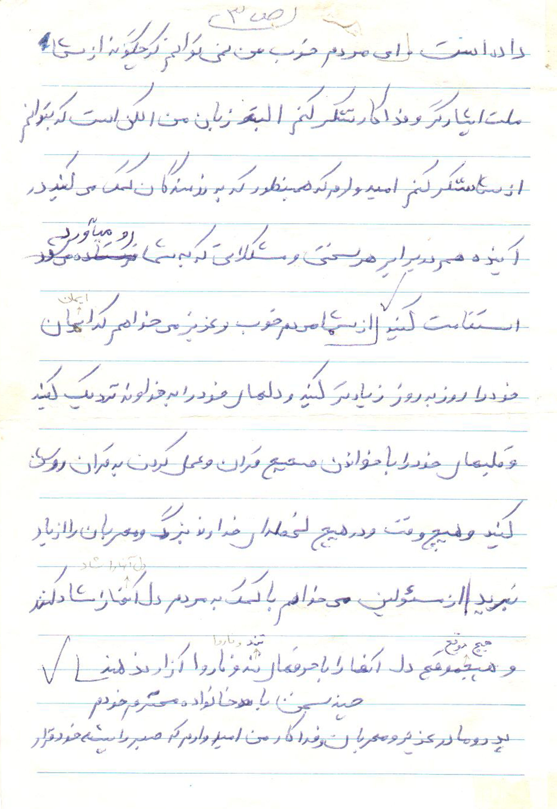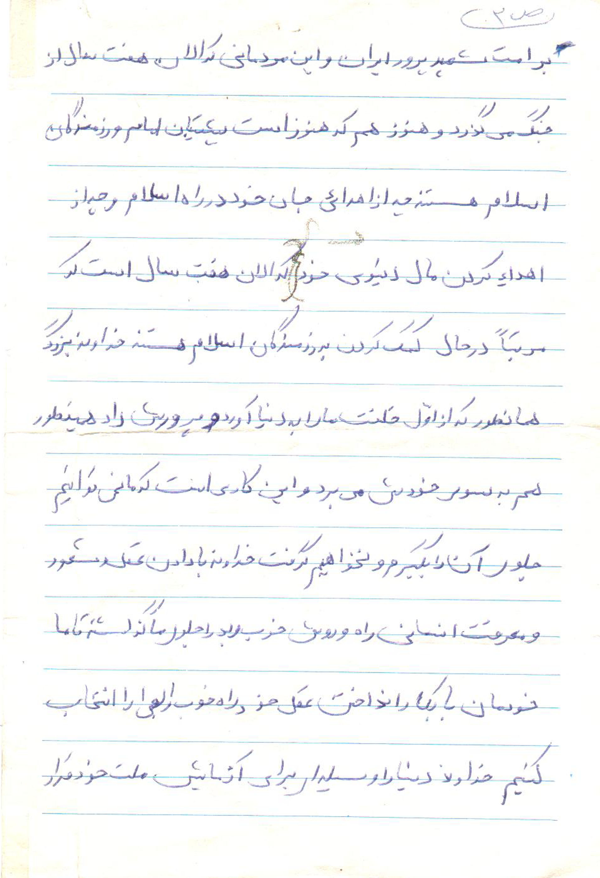با درود و سلام بر حضرت مهدى و نائب بر حقش بت شکن تاریخ و درهم کوبنده ستمگران و یاور مستضعفان و جداکننده حق از باطل رهبر عزیزمان امام خمینى و رهبر ملت جهان و پشتیبان حضرت مهدى و یار ملت مسلمان جهان با درود و سلام بر شهداء و خانواده هاى شهدا و با درود و سلام بر معلولین و مجروحین و اسراء و مفقودالاثرها و جانبازان و خانواده هاى محترم و این از جان گذشته ها و با درود و سلام بر امت شهید پرور ایران و این مردمانى که الان هفت سال از جنگ مى گذرد و هنوز هم که هنوز است پشتیبان امام و رزمندگان اسلام هستند چه از اهدائى جان خود در راه اسلام و چه از اهداء کردن مال دنیوى خود که الان هفت سال است که مرتبا در حال کمک کردن به رزمندگان اسلام هستند خداوند بزرگ همانطور که از اول خلقت مرا به دنیا آورد و پرورش داد همینطور هم به سوى خودش برد و این کارى است که ما نمى توانیم جلوى آن را بگیریم و نخواهیم گرفت ؟؟؟ و نه با دادن عقل و شعور و معرفت انسانى راه و روش خوب ؟؟؟ جلوى ما گذاشته تا ما خودمان با بکار انداختن عقل خود ؟؟؟ را انتخاب کنیم خداوند دنیا را وسیله اى براى آزمایش ملت خود قرار داده است . اى مردم خوب من نمى توانم که چگونه از شما ملت ایثارگر و فداکار تشکر کنم البته زبان من الکن است که بتوانم از شما تشکر کنم امیدوارم که همینطور که به رزمندگان کمک مى کنید در آینده هم در برابر هر سختى و مشکلاتى که به شما رو میآورد استقامت کنید از شما مردم خوب و عزیز مى خواهم که ایمان خود را روز به روز زیادتر کنید و دلهاى خود را به خداوند نزدیک کنید و قلبهاى خود را با خواندن صحیح قرآن و عمل کردن به قرآن روشن کنید و هیچ وقت و در هیچ لحظه اى خداوند بزرگ و مهربان را از یاد نبرید از مسئولین مى خواهم با کمک به مردم دل آنها را شاد کنند و هیچ موقع دل آنها را با حرفهاى تند و ناروا آزار ندهند