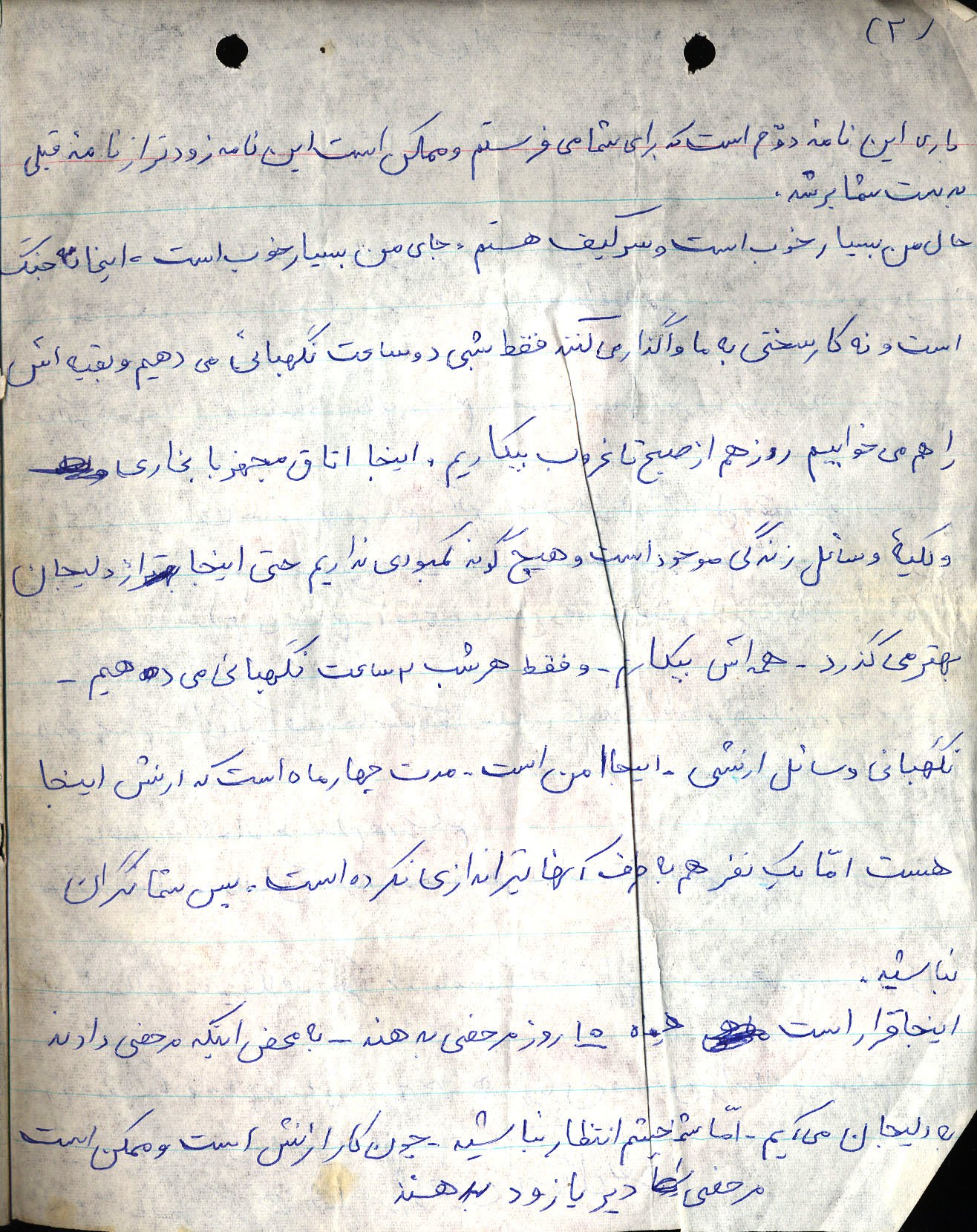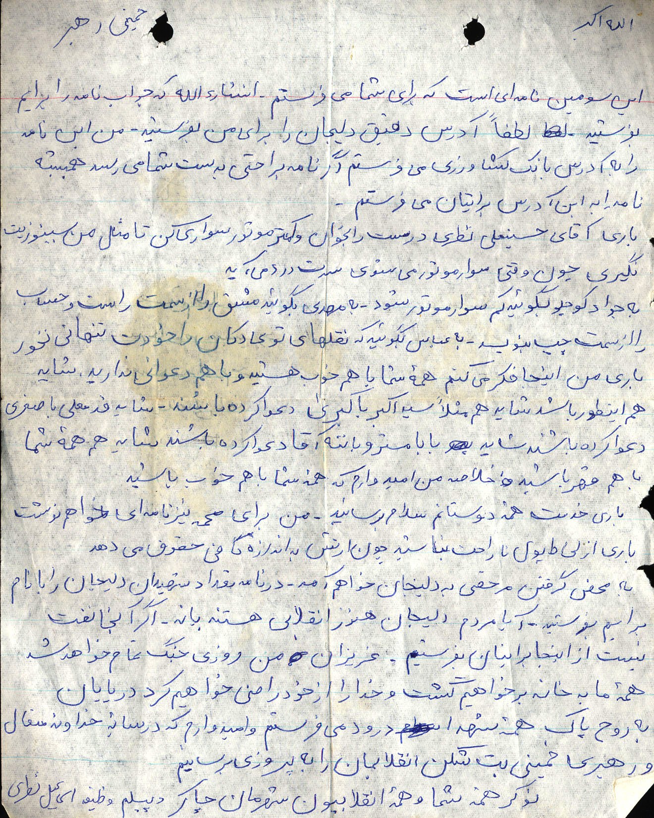 باری خدمت پدر و مادر عزیزم سلام می رسانم و امیدوارم که باور کنند که جای من بسیارخوب است نه جنگی و نه دعوائی. کار من فقط 2 ساعت نگهبانی از اتاقی که در آن می خوابیم است اینجا که ما در آن هستیم قبلاً به وسیله ارتش پاکسازی شده است و ضد انقلاب ها را دستگیر کرده اند . به خدا قسم جای من بسیارخوب است و اگر شما ناراحت باشید بی خودی ناراحت هستید.