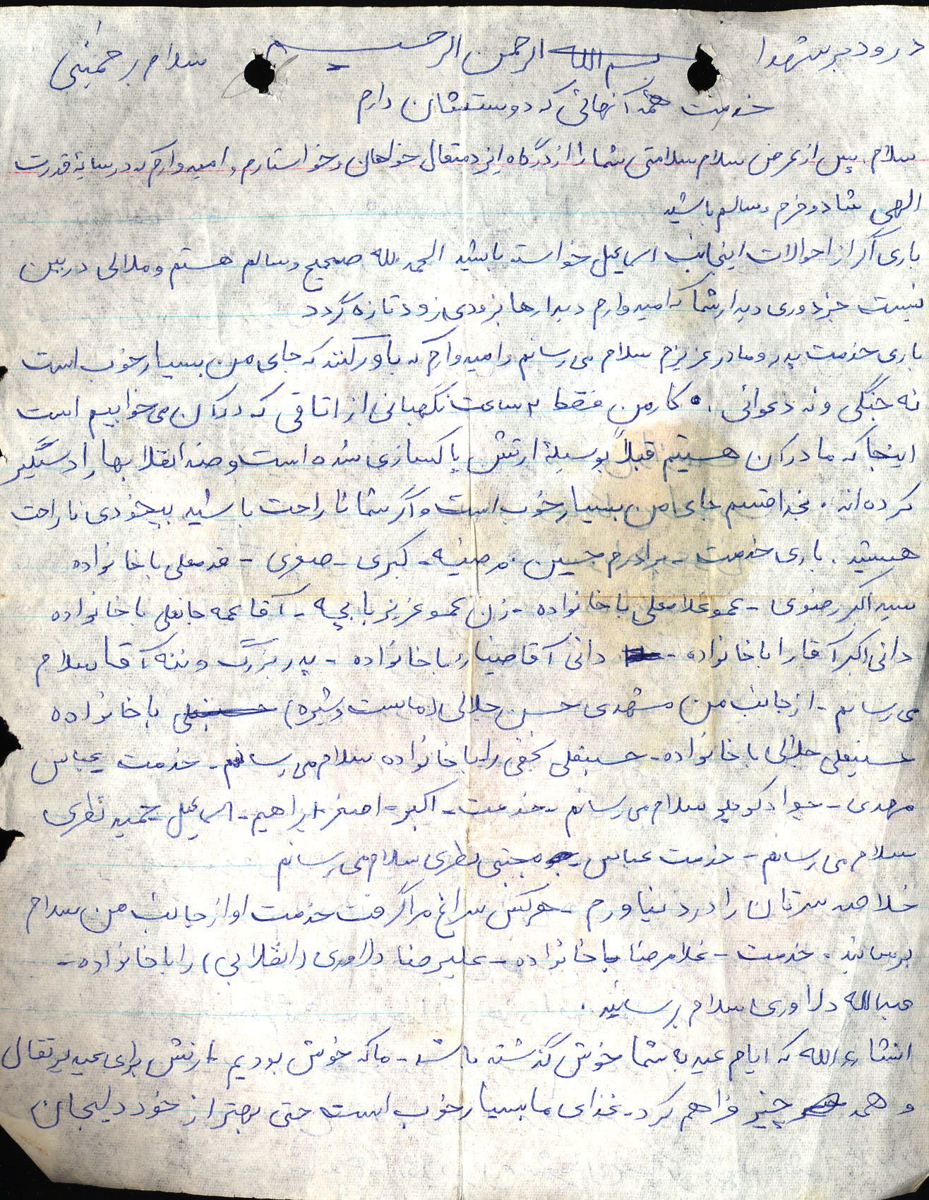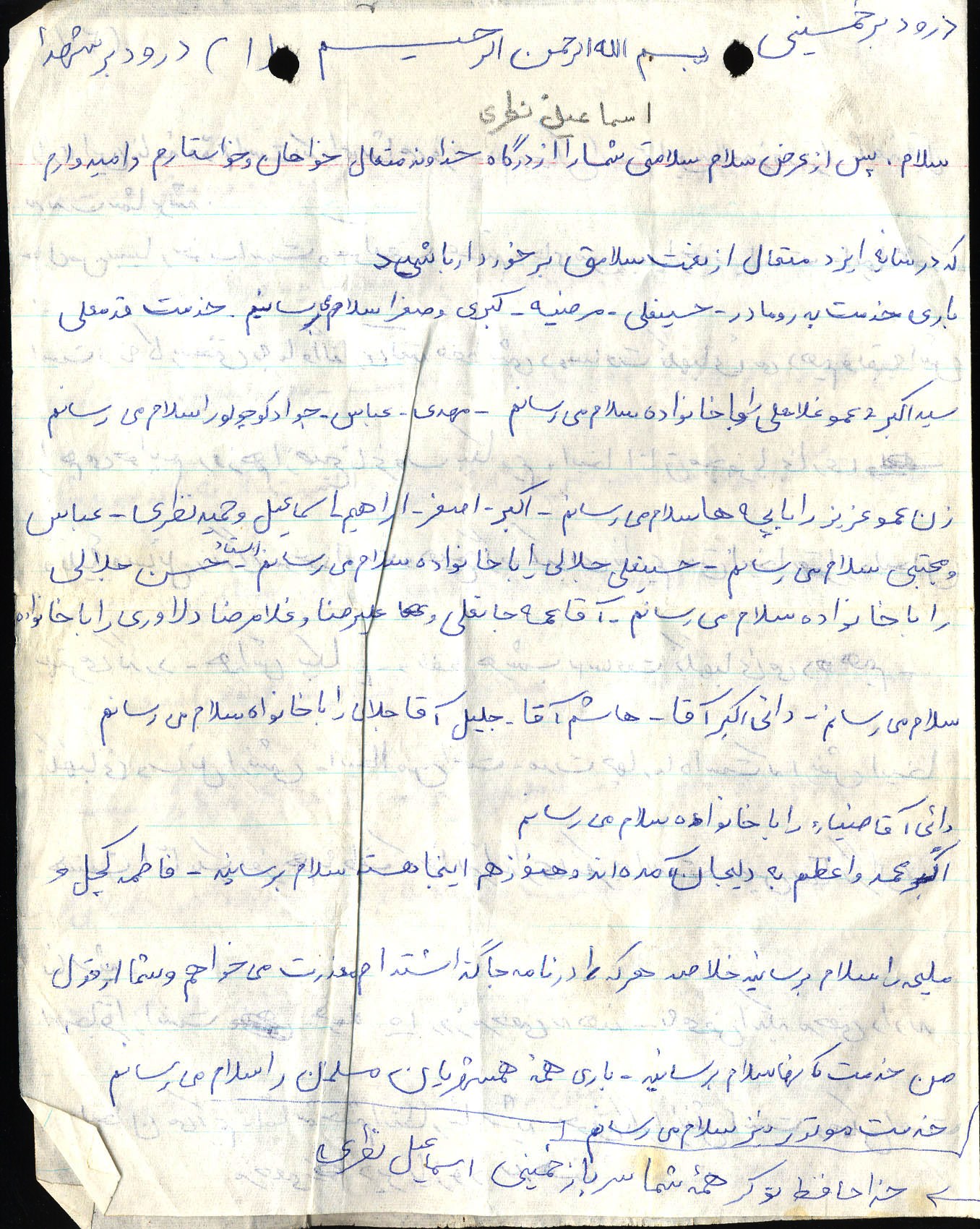 باری خدمت برادرم حسین،مرضیه،کبری،صغری،قدمعلی با خانواده ، سید اکبررضوی،عموغلامعلی با خانواده، زن عموعزیزبا بچه، آقا عمه جانعلی با خانواده، دائی اکبرآقا را با خانواده ، دائی آقا ضیاء با خانواده، پدربزرگ و ننه آقا سلام می رسانم. از جانب من مشهدی حسن جلالی (ماست وشیره) با خانواده ، حسینعلی جلالی با خانواده، حسینعلی نجفی را با خانواده سلام می رسانم. خدمت عباس ، مرضیه ، جواد کوچولو سلام می رسانم. خدمت اکبر،اصغر،ابراهیم،اسماعیل،حمید نظری سلام می رسانم. خدمت عباس،مجتبی نظری سلام می رسانم.