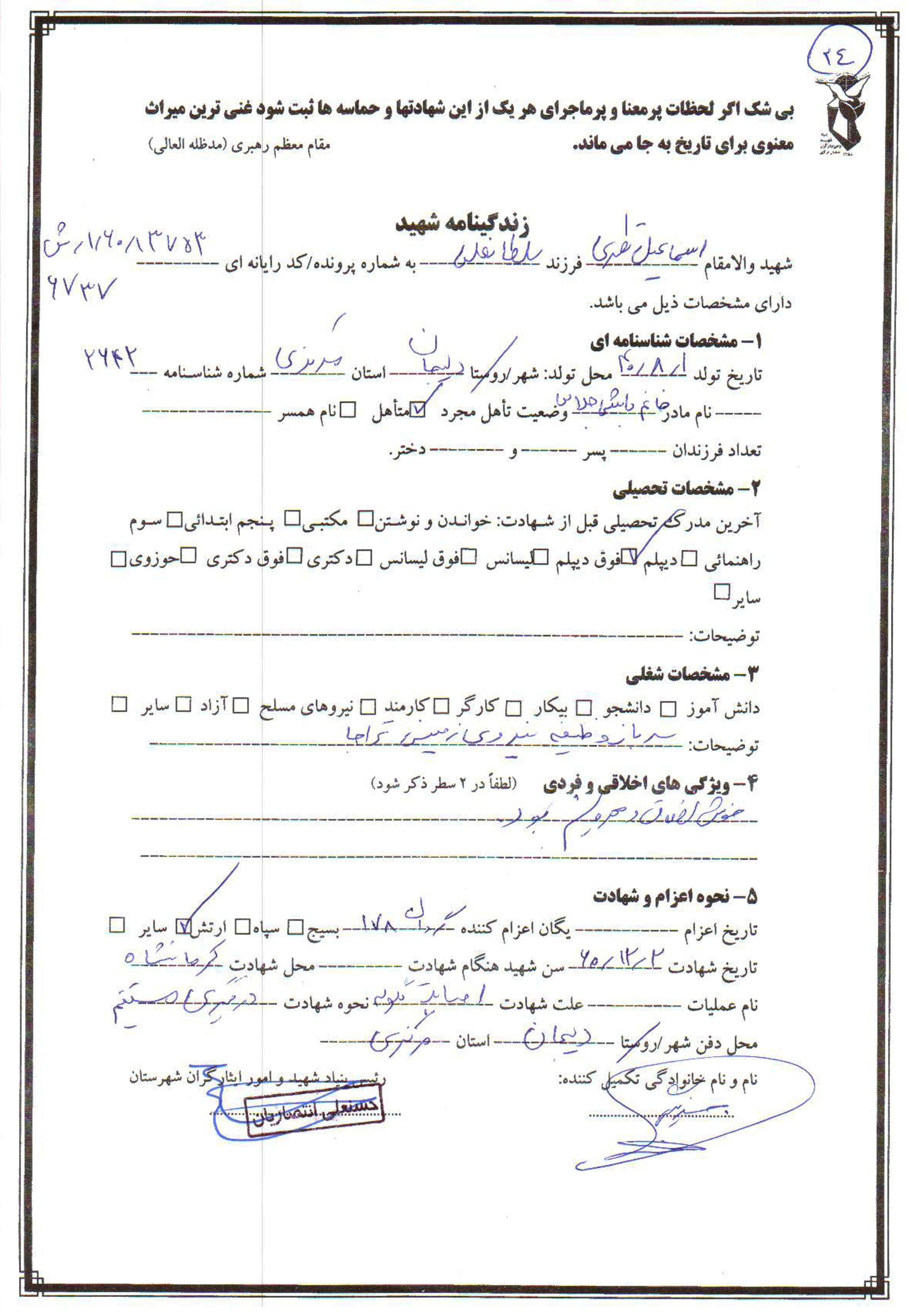 خانواده شهید اسماعیل نظری از اینکه سعادت دیدار با شما را نداشتیم طلب مغفرت می کنیم و به این نامه که ازطرف سربازان حزب الهی این یگان ارتش جمهوری اسلامی ایران تقدیم می شود اکتفا می کنیم که امیدواریم سلام مارا بپذیرید و ازتمام شما التماس شفاعت می کنیم.