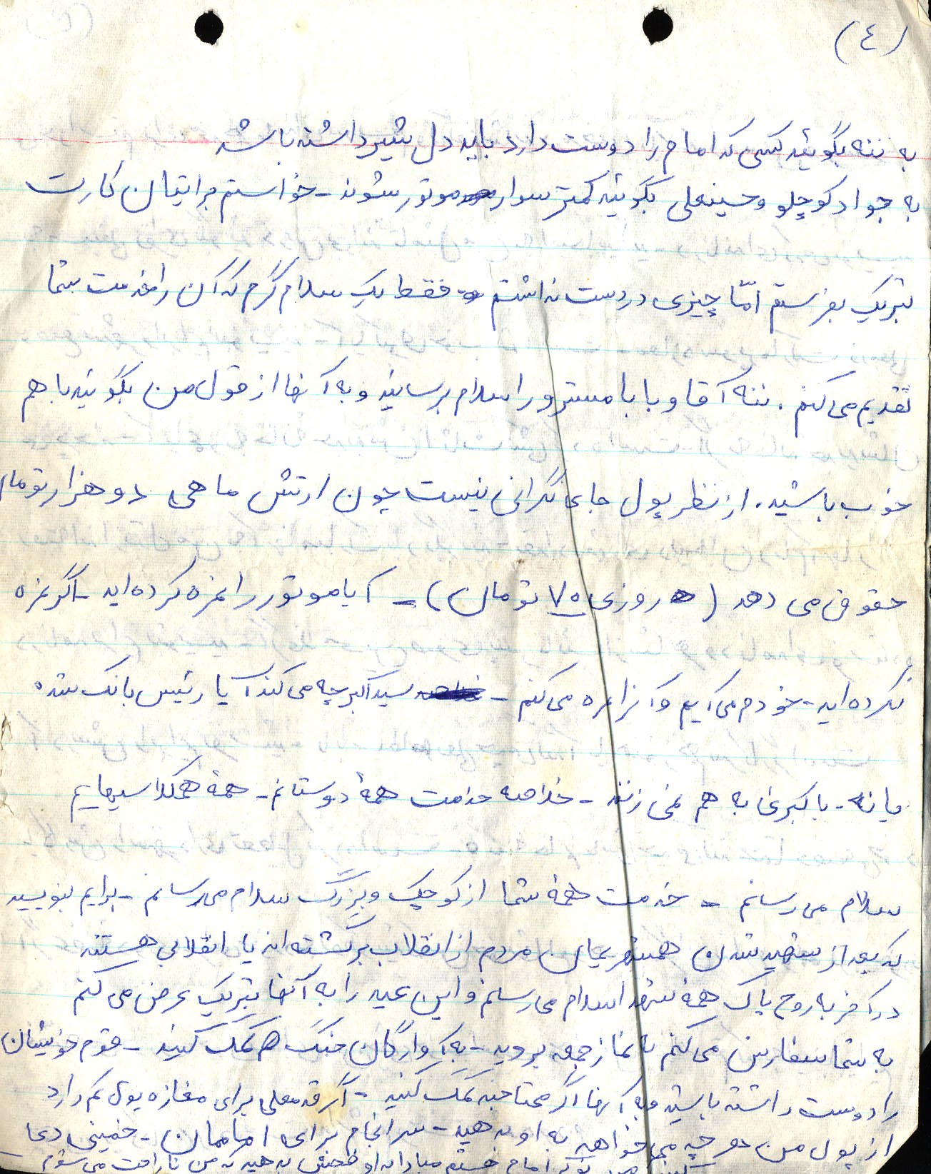 ننه آقا وبابا مسترو را سلام برسانید وبه آنها ازقول من بگوئید با هم خوب باشید. از نظر پول جای نگرانی نیست چون ارتش ماهی دوهزار تومان حقوق می دهد.(روزی 70تومان). آیا موتور را هم نمره کرده اید اگر نمره نکرده اید خودم می آیم و آنرا نمره می کنم.