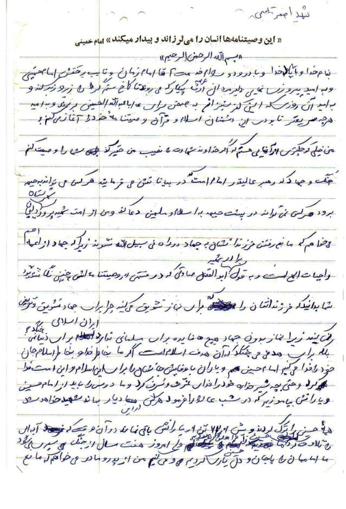 بنام خدا و با یاد خدا و با درود و سلام خدمت آقا امام زمان و نایب بر حقش امام خمینى و به امید پیروزى نهایى دلیر مردان عرصه پیکار که مى روند تا کاخ ستمگر را زیر و زبر کنند و به امید آن روزى که این کفر ستیزان به صحن و سراى ابا عبدا... الحسین برسند و به امید هر چه سریعتر نابودى این دشمنان اسلام و قرآن وصیتنامه خود را آغاز مى کنم.