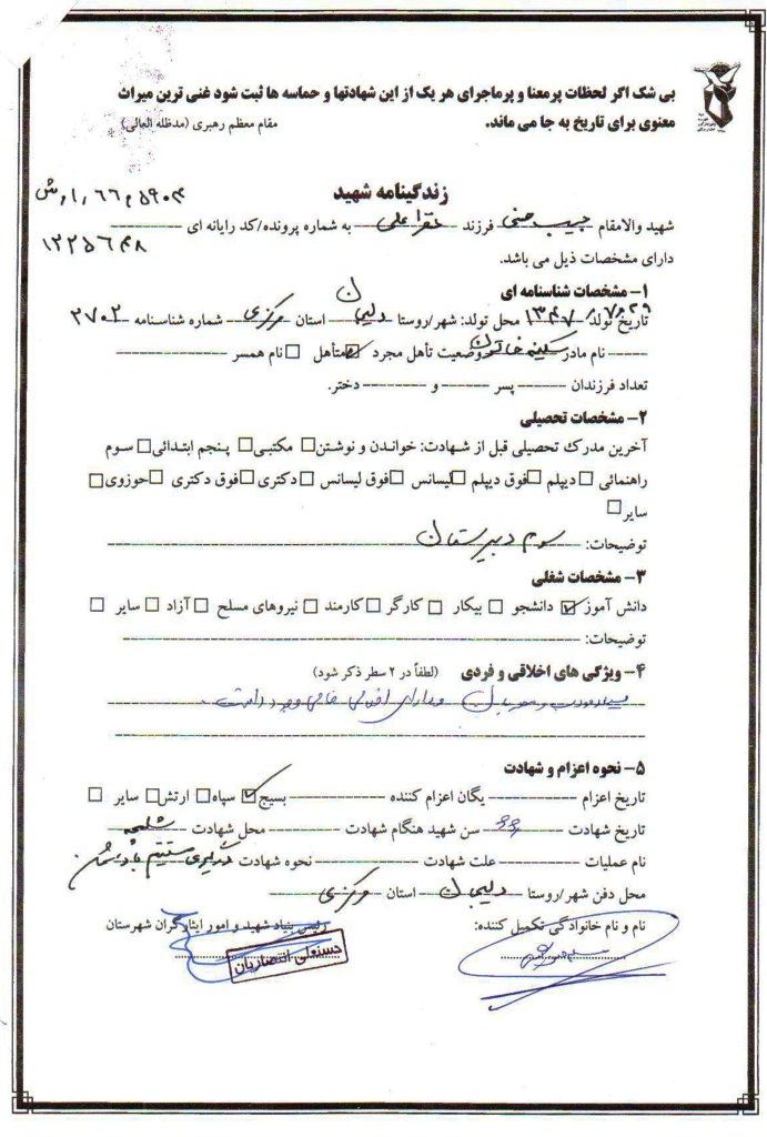 نام و نام خانوادگی: نظرعلی حسنی نسبت با شهید:پدرشهید