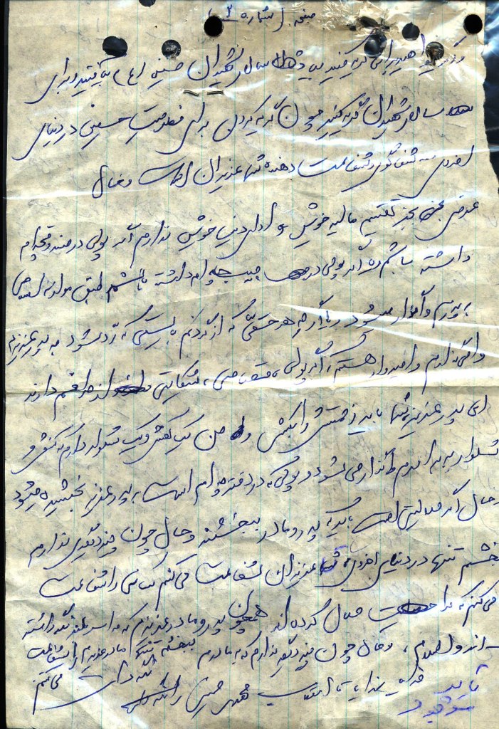 اگر مى خواهید براى من گریه کنید بیاد سالار شهیدان حسین (ع) بیفتید و براى سالار شهیدان گریه کنید چون گریه کردن براى مظلومیت حسین در دنیاى اخروى ثناگوى و شفاعت دهنده شما عزیزان است . و حال عضى بجز تقسیم مالیه خویش و اداى دین خویش ندارم اگر پولى در صندوقچه ام داشته باشم و یا اگر پولى در جیبم داشته باشم طبق موازنه اسلامى به پدرم واگذار مى شود و یا اگر حقى که از گردنم بایستى گه رد شود به پدر عزیزم وا مى گذارم و امیدوار هستم که اگر پولى قصاصى شکایتى از طرفم داردند اى پدر عزیز شما باید زحمتش را بکشى و من یک کفش و یک شلوار دارم که کفش و شلوار را به برادرم واگذار مى شود و پولى که در دفترچه ام است به پدر عزیز بخشیده مى شود و حال اگر حلالیتى است باید که پدر و مادر ببخشند و حال چون چیز دیگرى ندارم ببخشم تنها در دنیاى اخروى شما عزیزان شفاعت مى کننم کسانى را شفاعت مى کنم که مرا حلال کرده اند همچون پدر و مادر عزیزم که مرا سربلند نگه داشته اند .