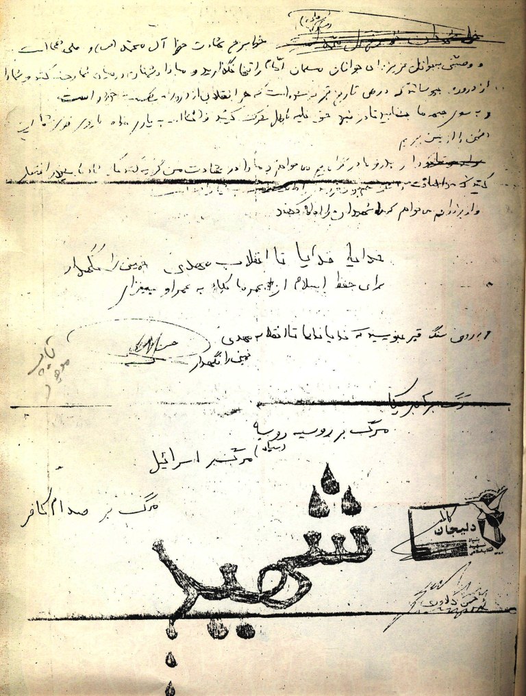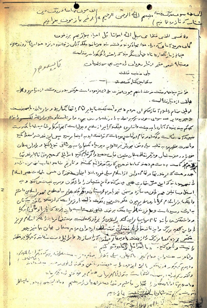 اولین سخنانم را با مردم آغاز مى کنم اى مردم دلیر و امت شکست ناپذیر امام را تنها نگذارید و براى مبارزه با صهیونیست بپا خیزید و این غده سرطانى به قول رهبر کبیر را در منطقه از بین ببرید و او تاب مقاومت در برابر الله اکبر را ندارد یک کم بیندیشید که آنان با چه پشت وانه اى مى جنگند آیا غیر از سلاح و پول است آنهم آمریکا و شما چه شما با یک دست غیبى در سر، الله دست کمک او در تمام اوقات بوده است که توانسته اید به اینجا برسید پس این قدرت را حفظ کنید و با قدرت عظیم خود به قلب سیاه دشمن یورش برید و این دیو سیاه نکبتبار را به روشنایى تبدیل کنید و برادران مسلمان خود را در جنوب لبنان و دیگر نقاط مسلمان نشین نجات دهید و اگر قیام کنید اسرائیل که هیچ حتى تمام ابرقدرتها هم که دست به دست هم دهند که داده اند هیچ کارى نمى توانند بکنند و تاریخ شاهد ؟؟؟ بود و هست که ابرقدرتها در تمام دوران از اسلام سیلى خورده اند اینان هنوز آن حس شهادت طلبى اسلام را نفهمیده اند که این حس شهادت طلبى چه مى کند و کاخ نشینان را واژگون و سر به نیست مى کند و به اسفل و سافلین جهنم روانه مى سازد و سخنى نیز با مردم عربستان و دیگر کشورهاى به اصطلاح جمهورى اسلامى داشتم و اینکه ما براى اسلام عزدار مى شویم چون حکومت ؟؟؟ حکومت ذلت بارترى است که از فاسد خائن به آنان به ارث رسیده است و هم فرزند او اینک بر تحت شاهى نشسته است و این یزید که یار با وفاى آمریکا و واشنگتن مى باشد تمام سرمایه هاى این کشور اسلامى را بر باد داده است و نه تنها سرمایه را بلکه اسلام عزیز را و این کعبه بزرگ و این خانه خدا را با خفقان تحت سلطه دارد و اى مردم مسلمان جهان بپا خیزید و قدس عزیز و کعبه بزرگ را از دست معاویه هاى ؟؟؟ آزاد سازید و اسرائیل دست نشانده آمریکا در منطقه را نیست و نابود کنید (ما اسرائیل را نابود مىکنیم)