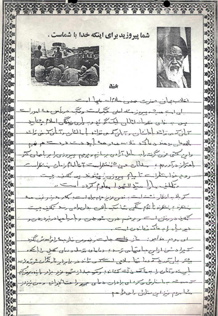ای امت همیشه پیروز مسئله اصلی جنگ است و جنگ در ؟؟؟؟؟؟؟همه امور است پس به ندای مظلومانه امامان لبیک گوئید و به یاری رزمندگان اسلام بشتابید آنانی که می توانند با جانشان و آنانی که می توانند با مالشان و آنانی که نمی توانند مال و جان بدهند دعا کنند خلاصه همه و همه باید دست در دست هم نهیم واین کشتی خون گرفته را به ساحل آزادی برسانیم وپرچم پیروزی را بر بامهای کفر به ؟؟؟؟؟؟؟؟؟؟؟؟؟در آوریم، مسلمانان حسین (ع) منتظر است آقا امام زمان منتظر است روح خدا منتظر است تا پیام پیروزی را بشنوند پس تکلیف چیست